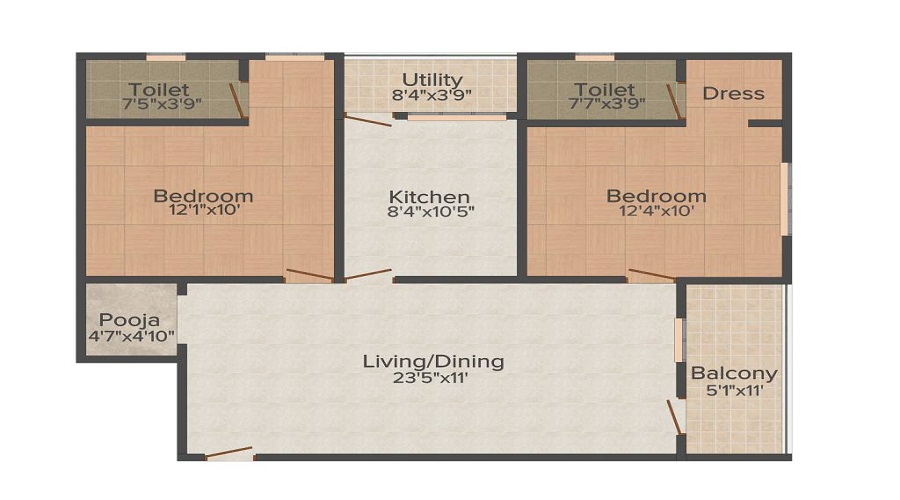 The Apartments in Bsr Shelters are available in various sizes, from 2 BHK+2T units starting at 985 sqft to larger 2 BHK+2T Apartments up to 1060 sqft. These varied options provide flexibility for buyers to choose the apartments that fits their family’s needs.