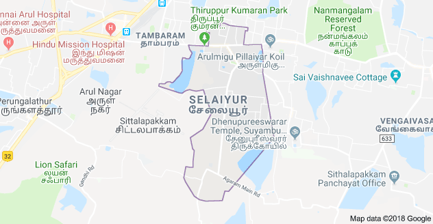 Selaiyur is a Neighbourhood near Tambaram, Chennai (Madras). This Place is located on the Tambaram - Velachery Road. Once upon a time, this place was called as Silaiyur.[1] Neighbouring towns include Tambaram, Madambakkam, Rajakilpakkam, Sembakkam, Chitlapakkam and Medavakkam. The Indian AirForce has one if its bases here. It has been a preferred area for most of the retired airforce families and hence there are mix of people like north Indians, andhraites, keralites etc. Over the past few years this suburb has rapidly developed in terms of population due to the presence of vast number of private companies (national and multi national) present nearby. The nearest neighbourhood station is Tambaram station and the Chennai airport (domestic and international) is only about 9 km away. Selaiyur has bus connectivity to all the main regions of the city. The East tambaram bus terminus is about 3 km away and passengers can also board the buses in camp road junction bus stop located in Selaiyur.